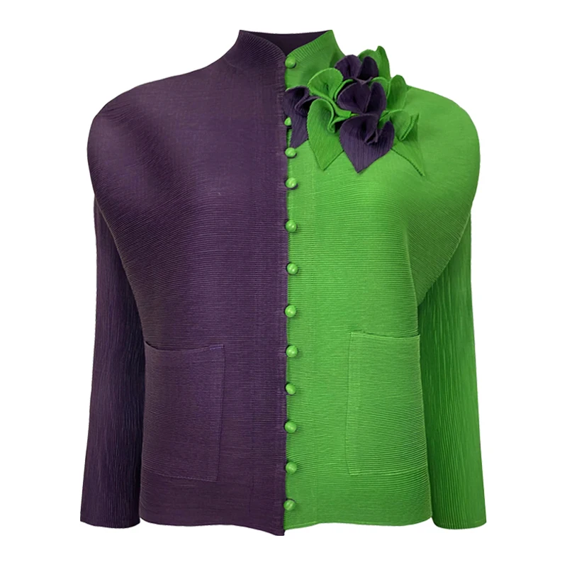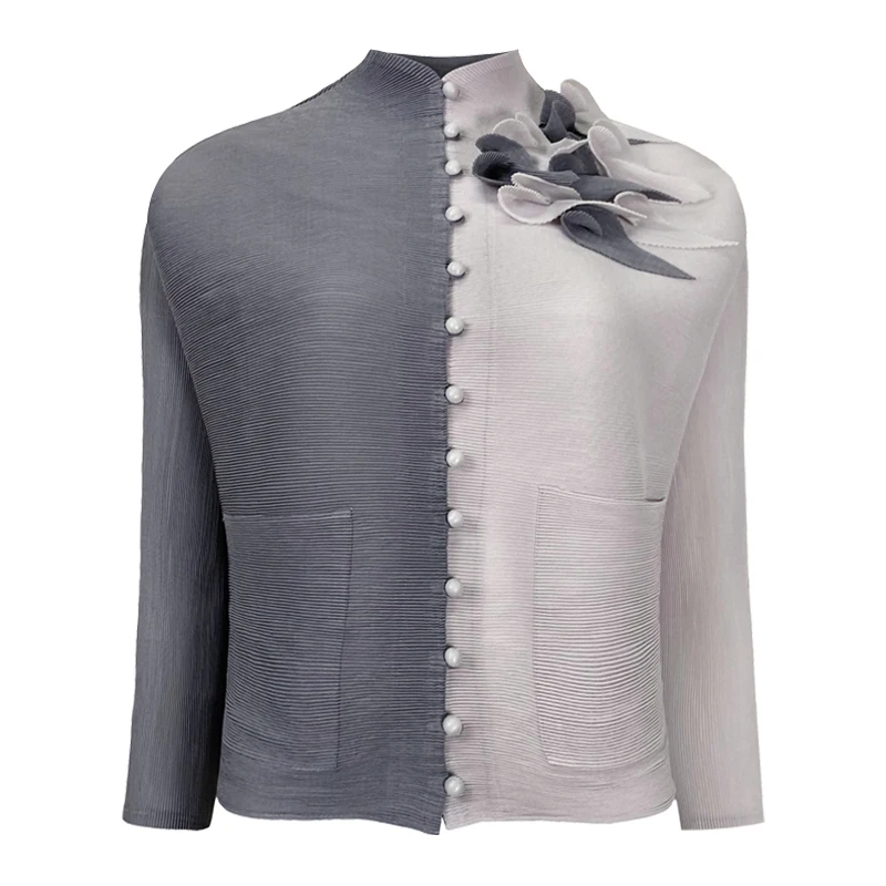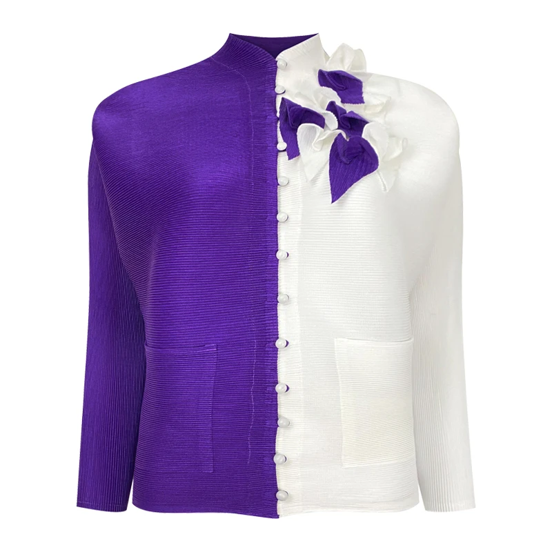 Casual V-neck Long Sleeve Button Shirt Contrast Color Stereoscopic Floral Embellishment Top Pleated Women's Blouse